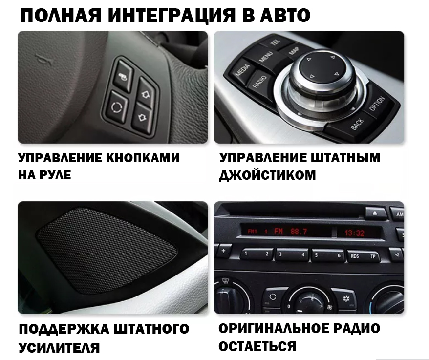 Особенностью и большим преимуществом устройства Commander BM-E70 для BMW X5 (E70) 2007-2012 является то, что оригинальная система NTG остаётся в автомобиле и её функционал никаким образом не изменяется, т.е. все штатные функции продолжают работать. Меняется только экран, который дополняется блоком Андроид. Таким образом, в автомобиле будут работать две системы, оригинальная и Android, между которыми можно легко переключаться. Звук с Android подключается через штатный AUX порт (MMI порт). Наличие данного разъема также является обязательным критерием совместимости нашего устройства с Вашим автомобилем. Качество звучания общей системы также остается неизменным.