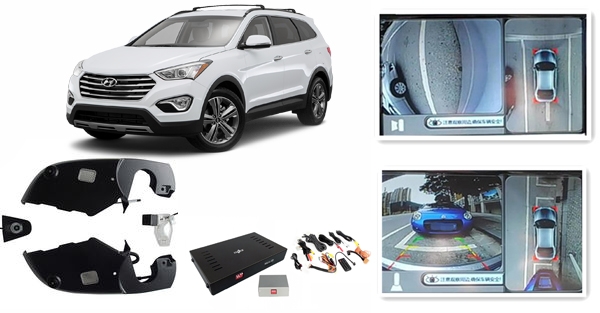 Комплект системы кругового обзора состоит из 4-х камер рассчитанных для установки в штатные места, специального блока обработки информации, функция которого объединять полученное с камер изображение в единую панорамную картинку, а также видеоинтерфейса, благодаря которому появляется возможность вывести готовый результат на экран родного головного устройства автомобиля Hyundai Santa Fe 2013-2016.