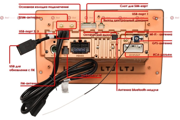 - Поддержка музыки с iPhone с подзарядкой по USB кабелю- AUX (1 видеовход и 2 линейных аудиовхода)